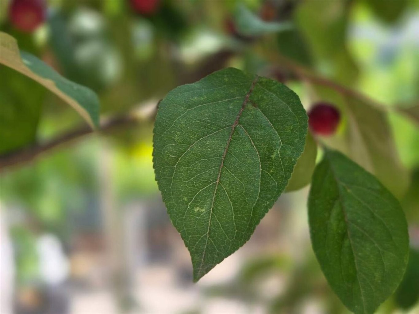 Het blad van de Malus ‘Mokum’ is eirond en brons, roodachtig van kleur. In de herfst kleurt het blad oranjegeel.