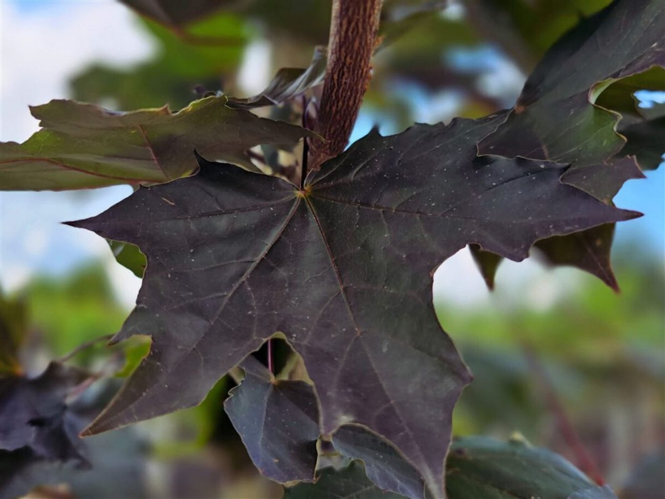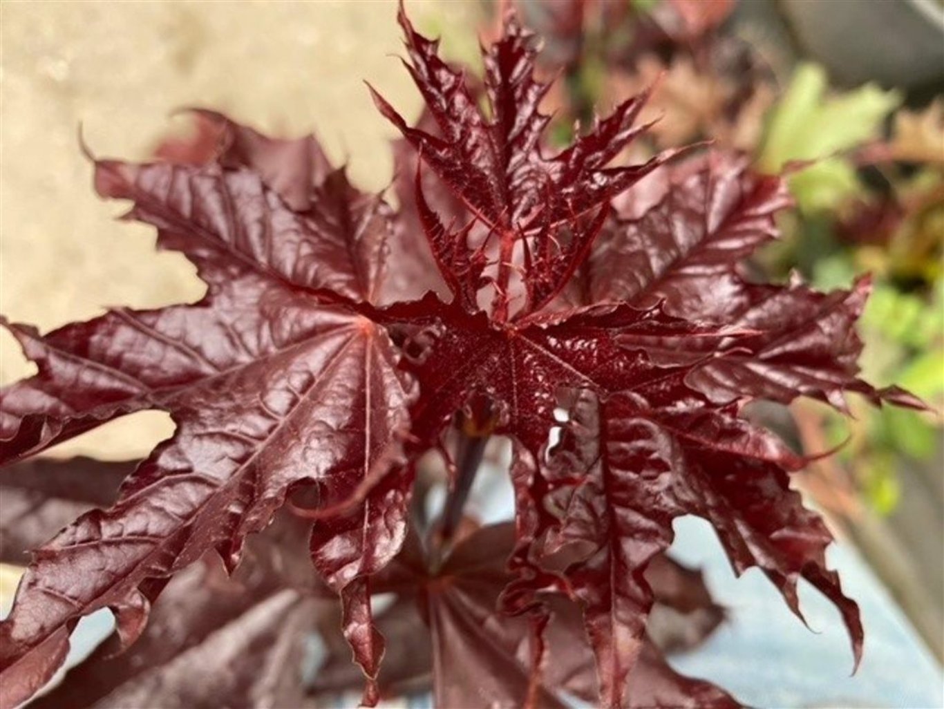 | Blad | 5-lobbig, glimmend donkerrood |
